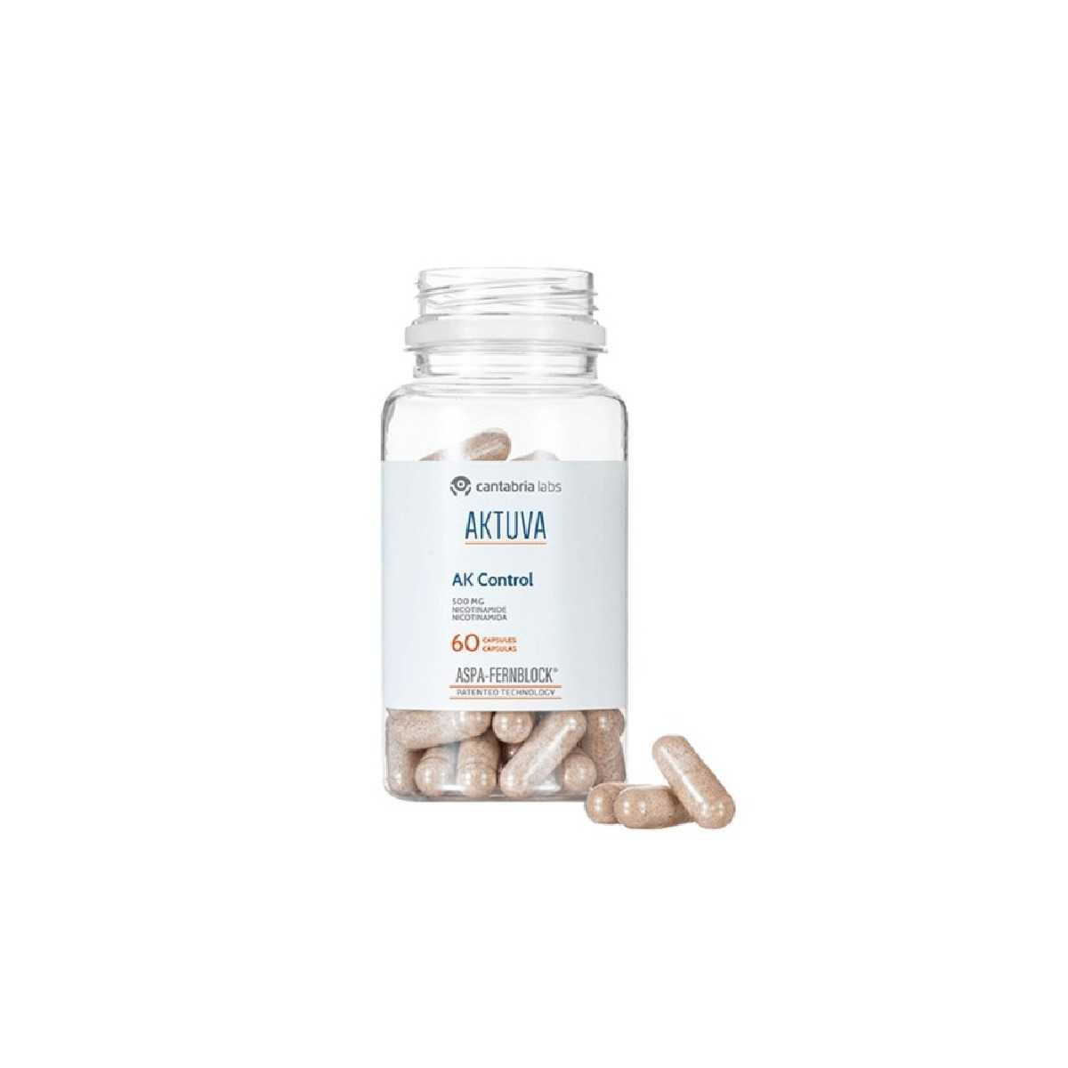 Aktuva AK Control 60 Cápsulas es un complemento alimenticio diseñado para proteger y mantener la salud de la piel cuando está expuesta de forma continuada al sol y a agresiones ambientales como la polución. Su fórmula exclusiva combina tecnología Aspa‑Fernblock® y nicotinamida (vitamina B3) para apoyar la defensa celular frente a los daños causados por la radiación solar y otros factores externos.