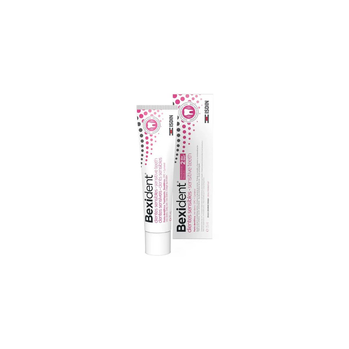 Bexident® Dientes Sensibles Pasta Dentífrica, con tecnología Dual Desensitizing Tech, alivia la sensibilidad dental y fortalece la salud de las encías. Remineraliza, protege el esmalte y aporta una triple acción antiplaca. Genera una acción antioxidante y aporta una acción prolongada.