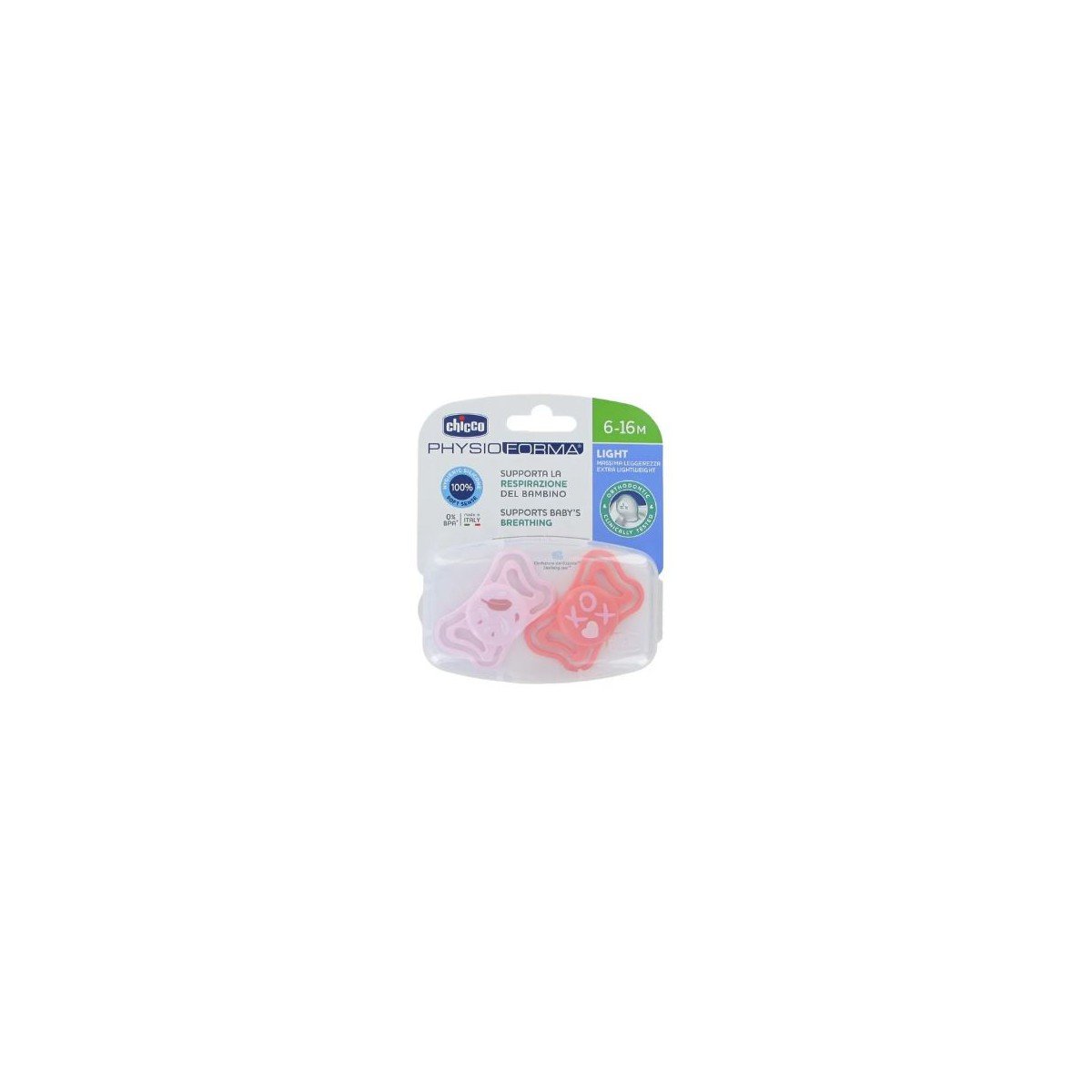 Todos los chupetes Chicco PhysioForma están desarrollados para ayudar a colocar la lengua hacia adelante y favorecer así la respiración fisiológica del bebé.