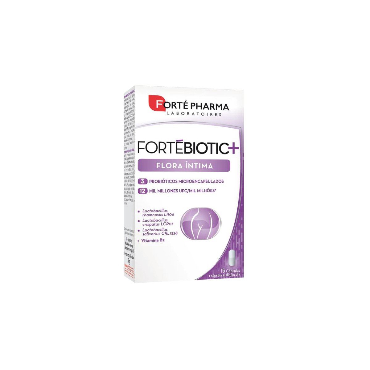 La fórmula de FortéBiotic+ Flora íntima asocia 3 cepas microbióticas microencapsuladas (12 mil millones UFC) y la vitamina B2 que contribuye al mantenimiento de las mucosas en condiciones normales.