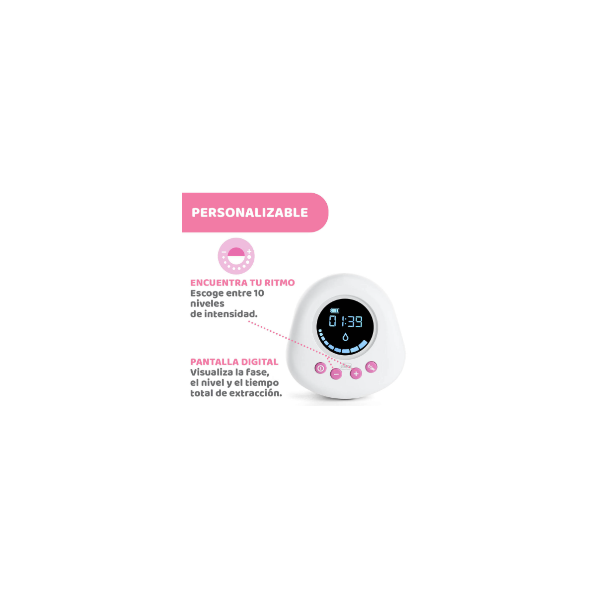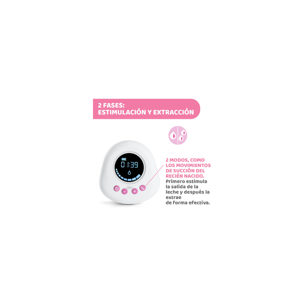 - 2 FASES: Se inicia en modo ESTIMULACIÓN, con un ritmo más rápido para estimular la producción de leche; después de 2 minutos cambia automáticamente al modo EXTRACCIÓN, más lento, para favorecer un flujo de leche constante y natural. También puede cambiar la fase manualmente cuando lo desees.